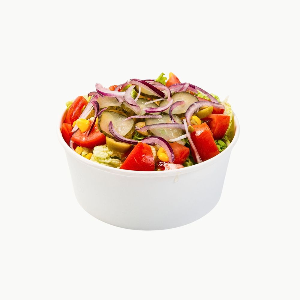 Листья салата, томаты, маслины, репчатый лук, бочковые огурцы, зеленая заправка.