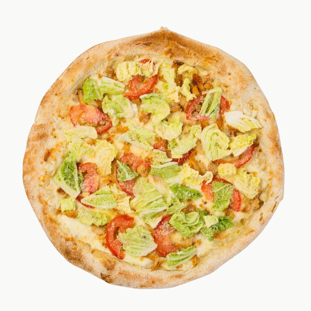 Цыпленок гриль, томаты, листья салата, моцарелла, соус цезарь. Диаметр пиццы 30 см