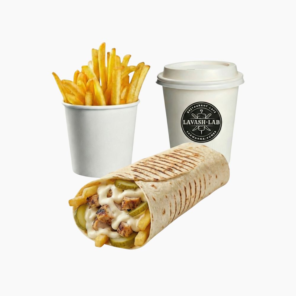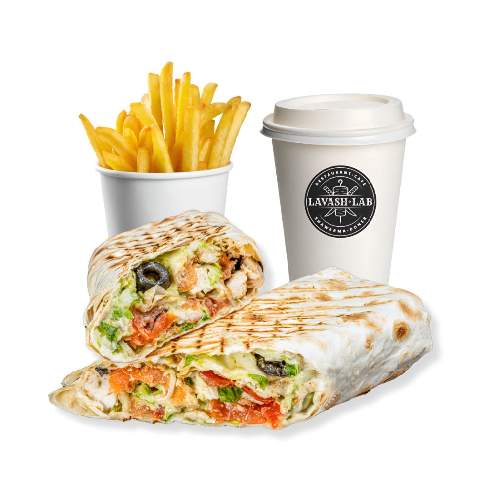 Выбор из 5 видов шаурмы, стандартный картофель фри и чай.