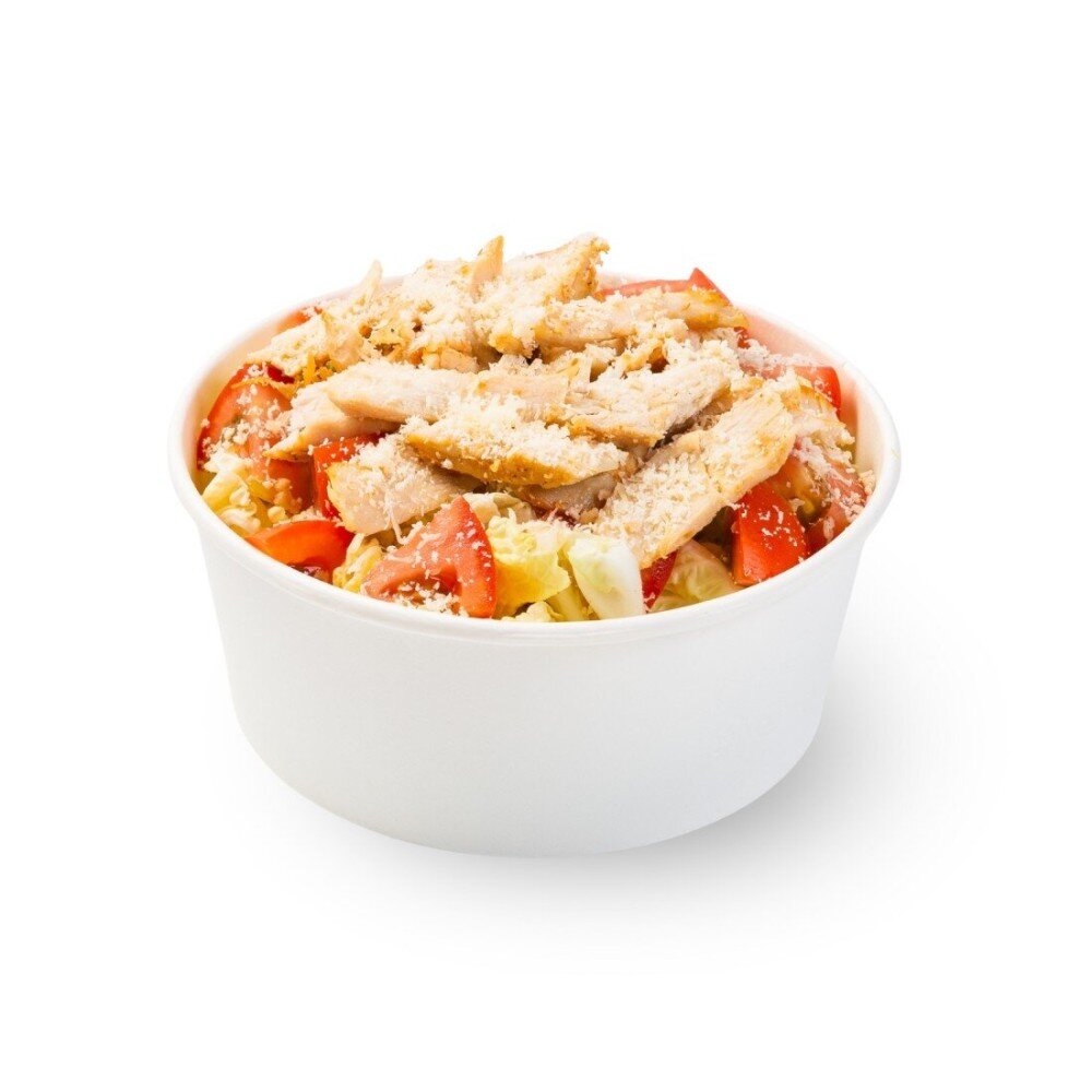 Листья салата, томаты, куриная грудка, пармезан, заправка цезарь
