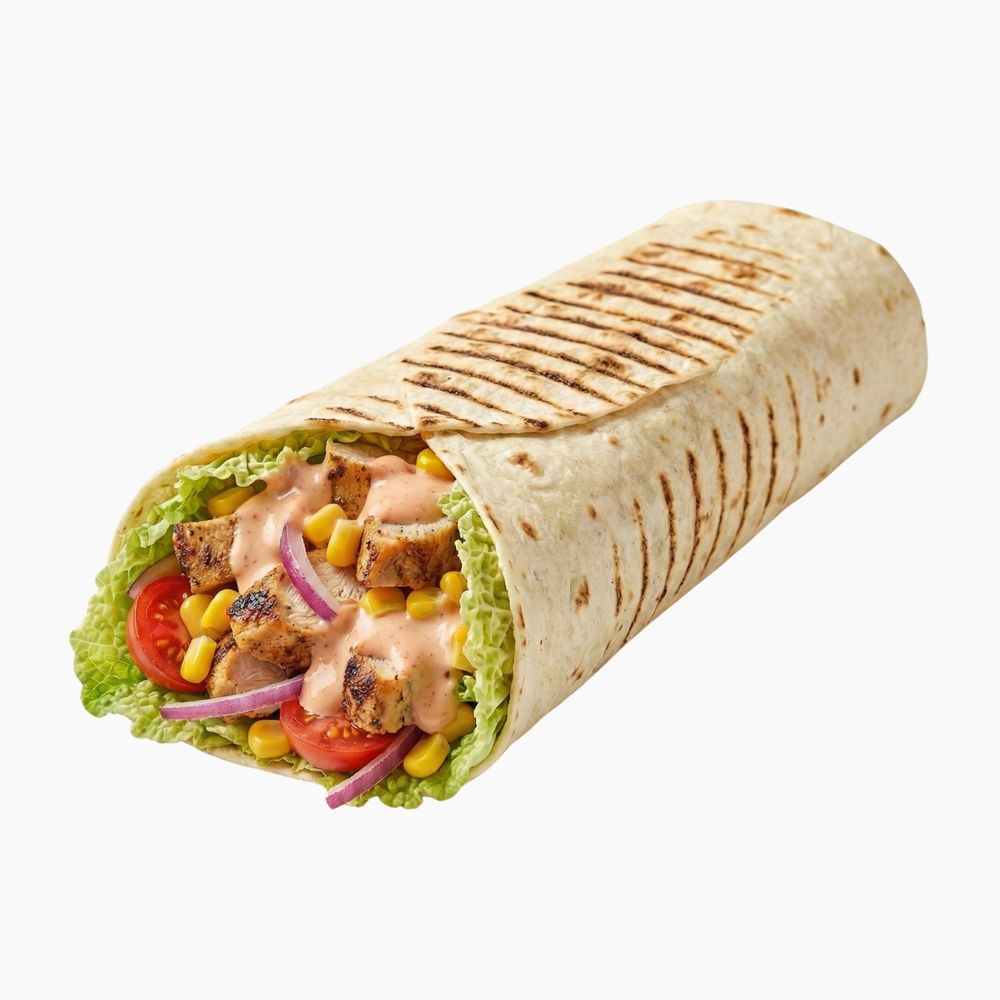 Куриная грудка в фирменном маринаде, томаты, кукуруза, репчатый лук, мексиканский острый соус